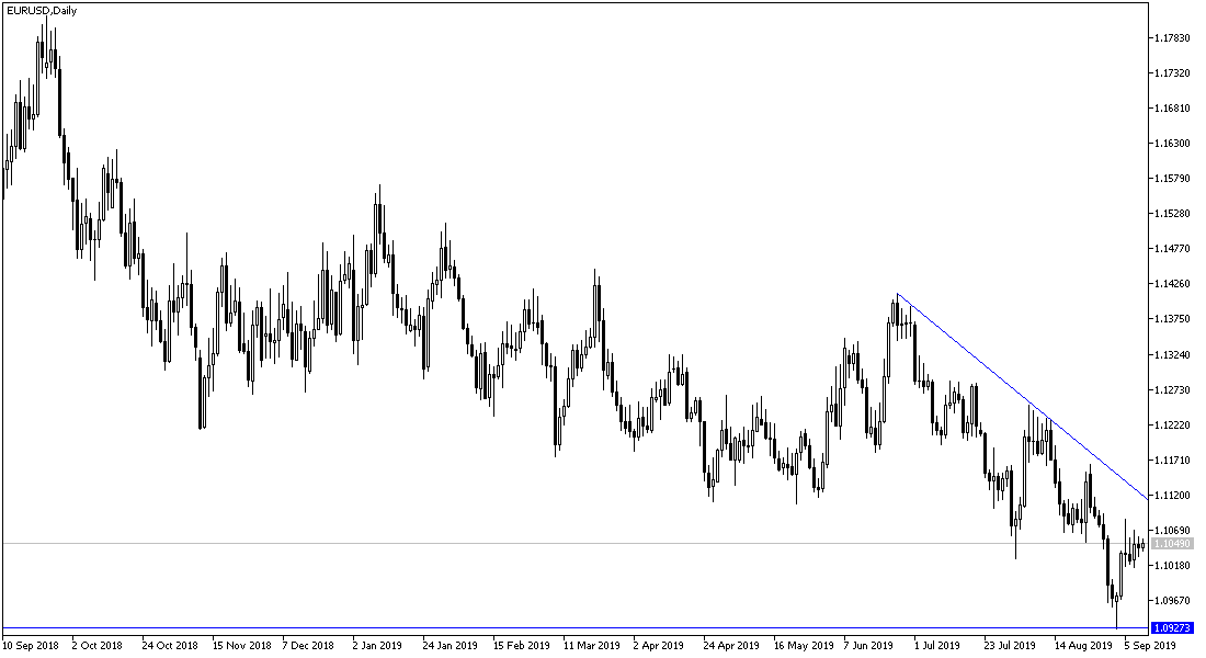 As we expected from the beginning of this week, the EUR/USD will continue to move in a limited and narrow range, which occurred, as the move remained between the 1.1011 support level and the 1.1068 resistance level and stable around 1.1045 at the time of writing. The pair's recent gains were supported by investor risk appetite amid a breakthrough between the US and China and the recent optimism about the future of Brexit. But the ECB's monetary policy decisions on Thursday may bring headwinds. European Central Bank President Mario Draghi is widely expected to announce a reduction in the euro zone deposit rate to a negative level at 12:45 am London time. The ECB is also likely to resume its quantitative easing program, which it ended in December 2018 in an attempt to achieve its inflation target by stimulating the economy via cutting borrowing costs. The economic slowdown in the Eurozone led by Germany has forced the European Central Bank to realistically make urgent plans to revive the region's economy.