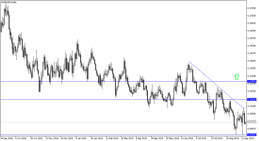 EUR/USD fell back to the 1.0993 support level as the pair failed to overcome the 1.1109 resistance which was successfully tested last week after the ECB announced its monetary policy and introduced more stimulus plans for the Eurozone economy. This performance confirms the strength of the downtrend as mentioned in previous technical analysis. After a long wait, the ECB last week cut interest rates and reinstated its bond purchase plans, which it terminated at the end of last year. The Euro did not react as strongly as expected, as markets wanted stronger plans and more stimulus as the Eurozone economy continues to suffer the consequences of the global trade war, which still lingers, with a loss of hope for a nearby solution to the dispute that threatens the future of global economic growth as a whole.