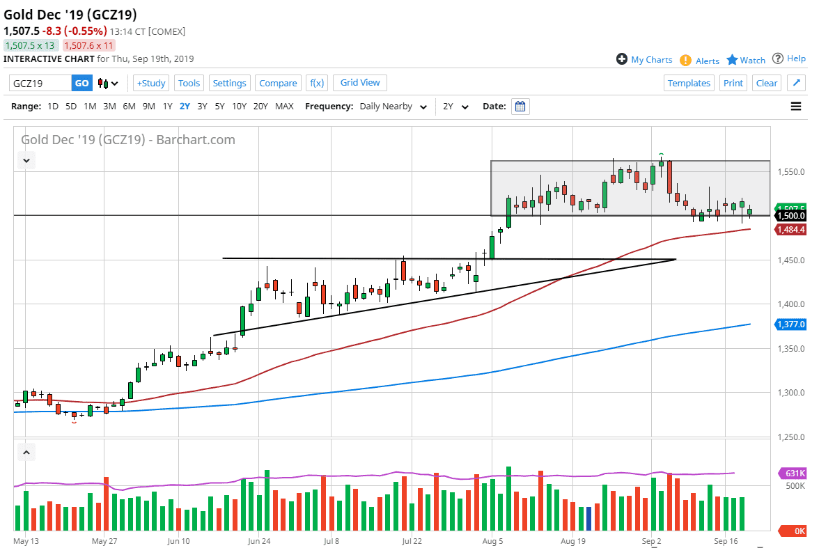 Central banks around the world continue to ease monetary policy, with the Federal Reserve being the last central bank to do so. In fact, you would be hard-pressed to find a central bank around the world that looks even remotely hawkish, so given enough time it’s likely that you have the perfect storm for gold to rally for a bigger move. Beyond that, the geopolitical situation continues to get dicey at best, so one would think that we are only a headline or two away from a jolt to the Gold markets to the upside as well.