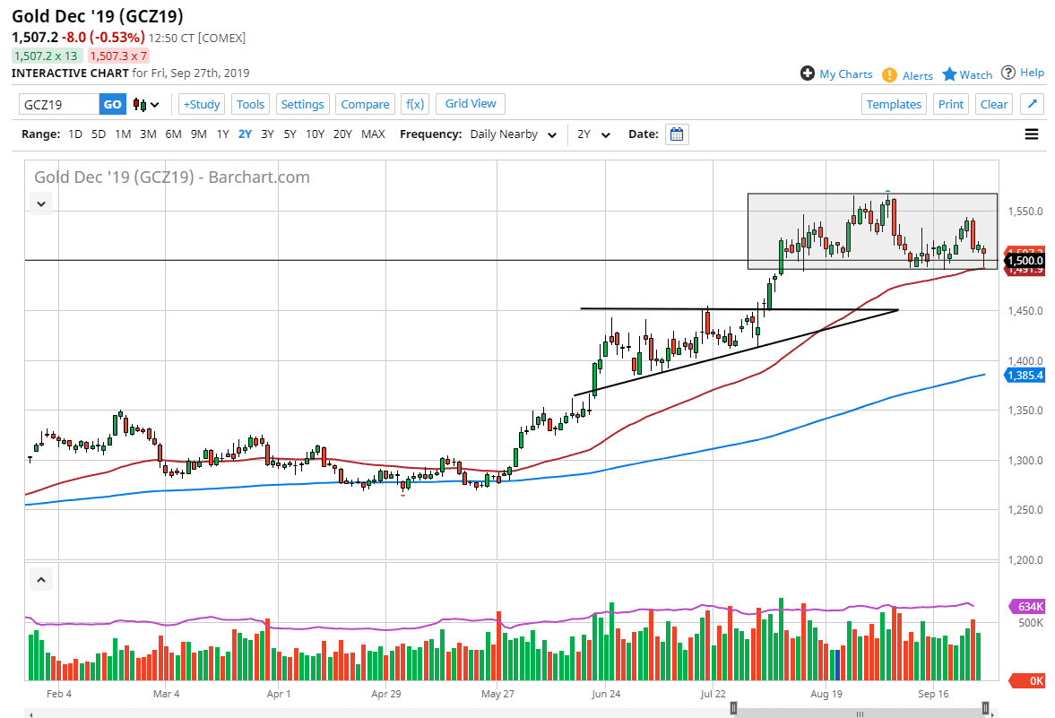 Gold markets initially fell during the Friday session, reaching down towards the 50 day EMA and of course the $1500 level. By bouncing the way we have late in the day, we have formed a bit of a hammer, and that of course is a bullish sign. On a break above the top of the daily candle stick, it is a classical technical analysis to start buying. However, if we were to break down below the 50 day EMA and the bottom of the hammer, that would send this market much lower, down to the $1450 level.