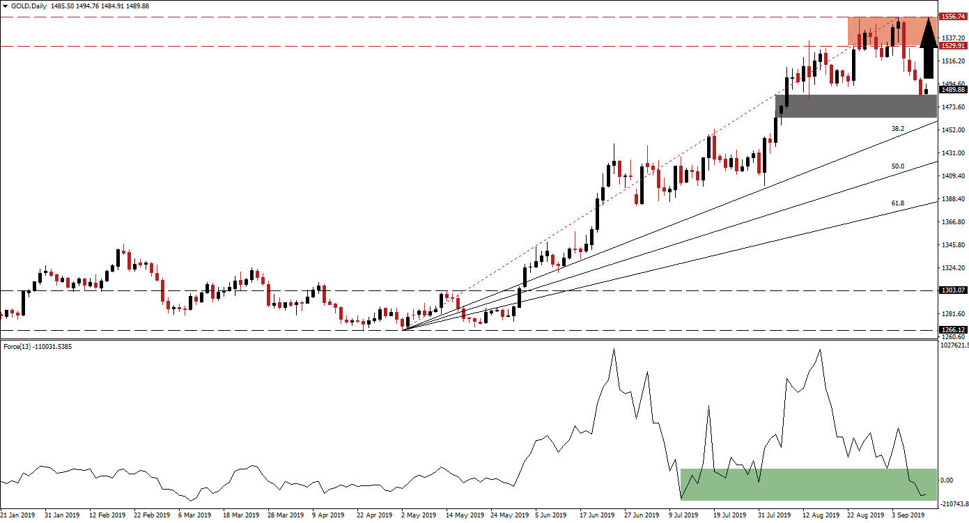 Gold is expected to carve out a short-term support zone located between its 38.2 Fibonacci Retracement Fan Support Level and the $1,484.40 level which represents the intra-day low of its last bearish candlestick. This is marked by the grey rectangle, but the support zone will narrow over time until it will vanish completely. Price action is expected to end its current sell-off inside of this support zone. A bullish crossover in the Force Index above 0 as well as global economic and geopolitical events are expected to combine and result in a new rally for gold, supported by central bank buying as monetary policy will see further easing in the developed world.