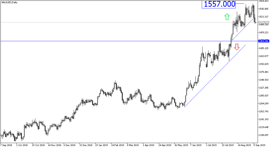 The gold price today and now is one of the most searched words and monitored items by investors over the past two weeks, with the price of gold reaching the $ 1557 level, the highest in six years. What stunned gold watchers was the collapse in the last two trading sessions of last week, as the price collapsed from $ 1557 resistance to $ 1502, as risk appetite increased, supported by positive comments on the US economy from Federal Reserve Chairman Jerome Powell. Speaking at a forum in Zurich, Switzerland, Powell said the central bank has helped keep the US economy firmly on solid ground amid the uncertainty caused by Trump's trade war with China.