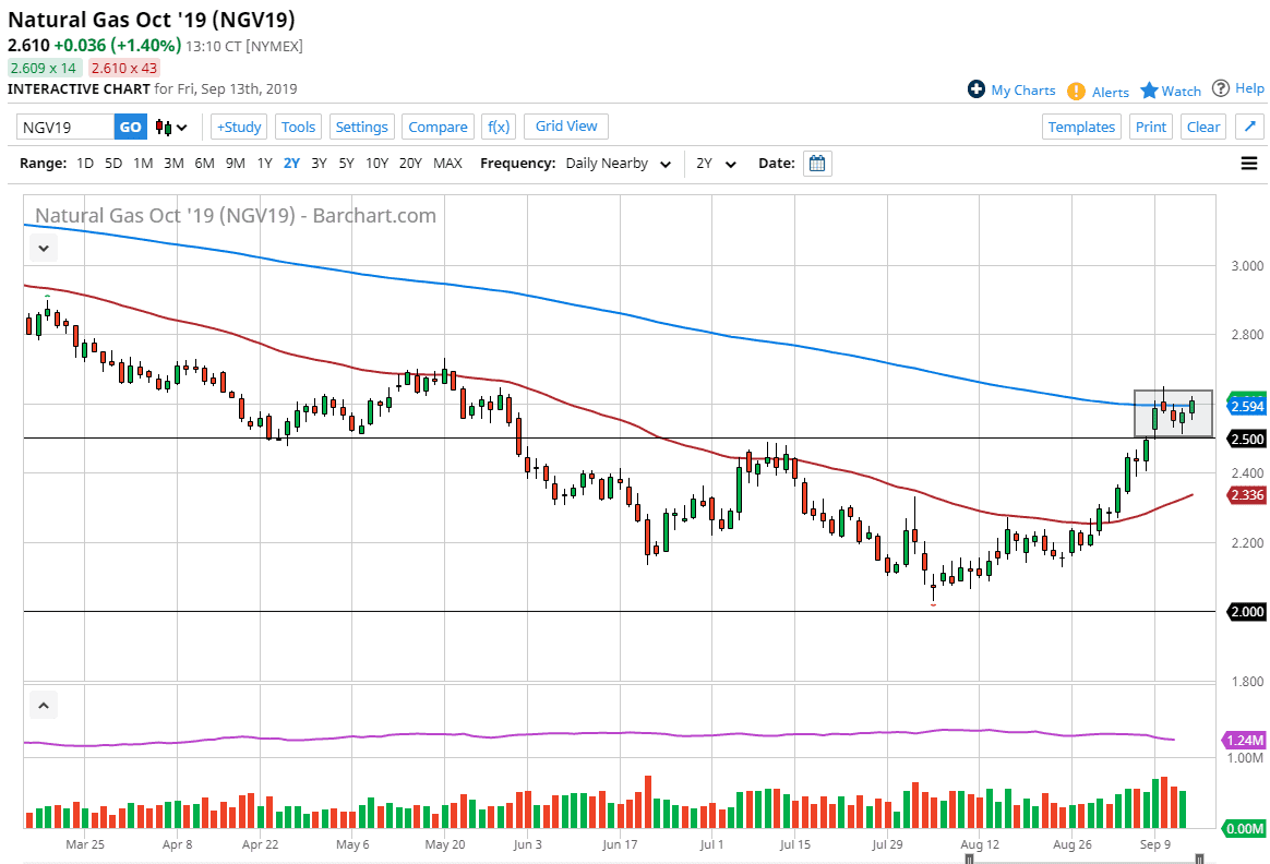 The natural gas markets initially pulled back a bit during the trading session on Friday but then turned around to reach towards the 200 day EMA yet again. At this point in time we are trying to figure out where were going to go next, and as we roll into the November contract, then we should start to see buyers jump in and take advantage of the winter demand that you normally get with natural gas. After all, the United States and Europe both will have a huge amount of demand for heating rather soon.