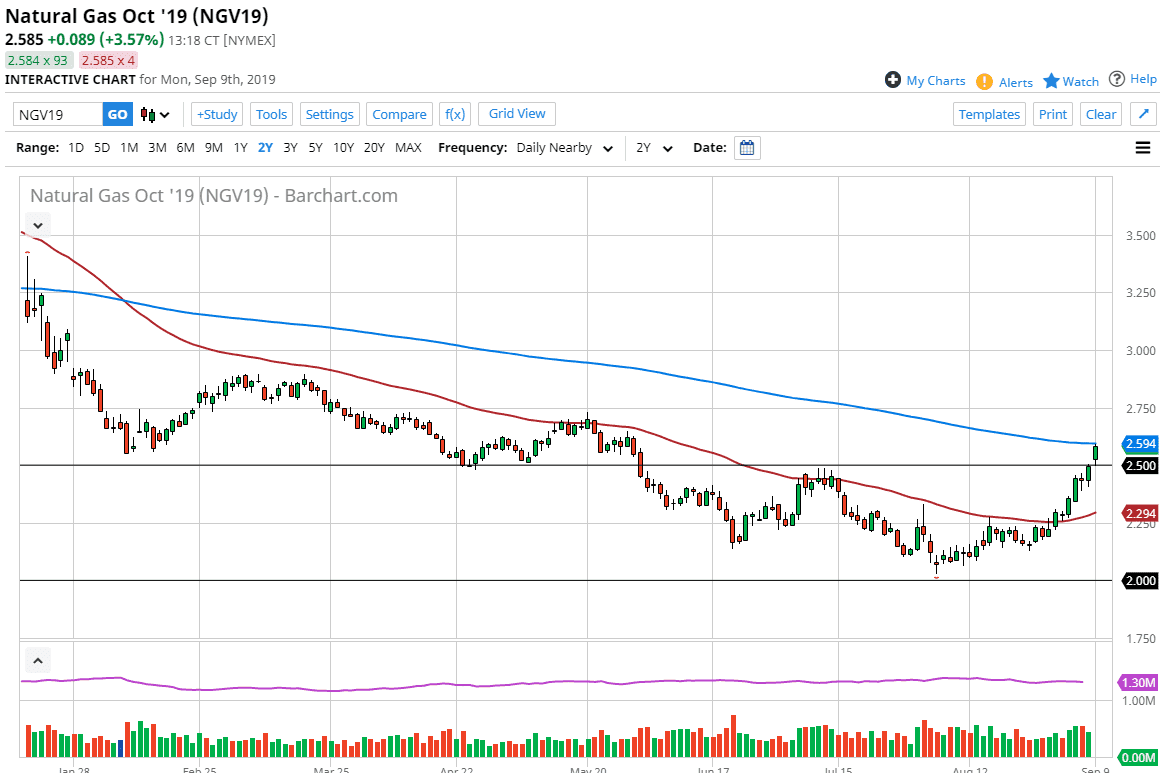 Natural gas markets rallied a bit during the trading session on Monday, reaching towards the vital $2.60 level, which is not only a large, round, psychologically significant figure. Beyond that it is also the scene of the 200 day EMA which should attract a lot of attention. Looking at this chart, it seems as if we are trying to enter the winter rally, but it is a bit early for that. We have been forming a bit of a base recently though, so having said that it’s likely that we are trying to get things going for the cold months in the United States and Europe.