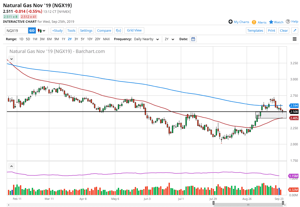 Natural gas markets initially pulled back during the trading session on Wednesday, breaking below the $2.50 level. That of course is an area that has a lot of interest attached to it as it is a large, round, psychologically significant figure. The area has offered both support and resistance over the past, so it makes quite a bit of sense that we dipped below it but then again found buyers underneath the turn things around and form a bit of a hammer like candle stick.
