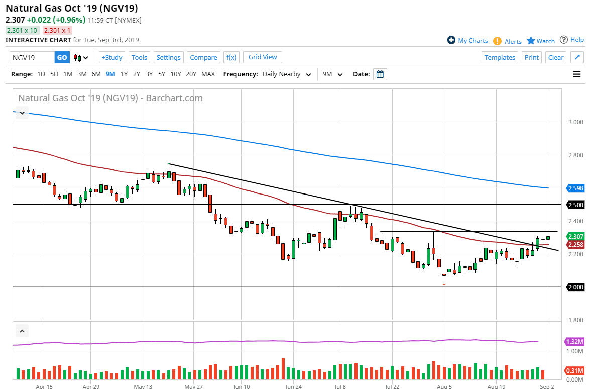 The alternate scenario would be breaking above the $2.35 level, opening up the door towards the $2.50 level. Remember, this time a year we do tend to have a bit of a pop higher rather soon as people will start to focus on that winter months in the United States and Europe. This drives up demand for natural gas, and therefore it of course will drive up price. Beyond all of that we also have hurricane Dorian hitting Florida and the Gulf of Mexico, and that could cause major issues and disruptions with the natural gas industry in the United States. However, this will be a short-term effect, so at this point it’s very likely that any rally at this point has a pullback in its short-term future. I don’t think that we can short this move for the longer-term move, but maybe a short-term selling opportunity will present itself. I still think that the big money will eventually be made buying dips at extraordinarily low levels. We are trying to form that base for the winter, and as we are trading the October contract, it makes quite a bit of sense we will see an impulsive weekly candle soon that will kick off the buying season.