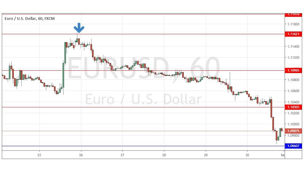We had expected the level at 1.1162 might act as resistance, as it had acted previously as both support and resistance. Note how these “flipping” levels can work well. The H1 chart below shows how the price rejected this level towards the start of last Monday’s Asian session, turning bearish right away with an engulfing candlestick marked by the down arrow signaling the timing of the turn. This trade has been very profitable, achieving a maximum positive reward to risk ratio of approximately 6 to 1 so far based upon the size of the entry candlestick structure, due to the fast, strong directional movement.