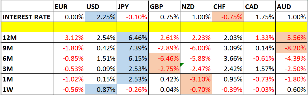 Let’s look at the relevant data of currency price changes and interest rates to date, which we compiled using a trade-weighted index of the major global currencies: