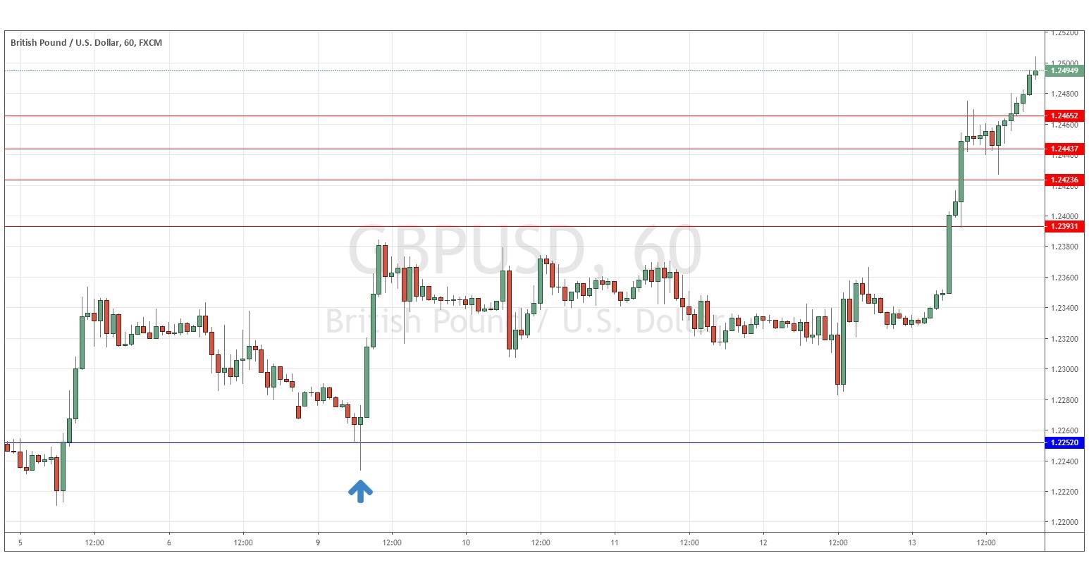 We had expected the level at 1.2252 might act as support, as it had acted previously as both support and resistance. Note how these “flipping” levels can work well. The H1 chart below shows how the price rejected this level right at the start of last Monday’s London session (a great time of day to trade the British Pound), turning bullish right away with a large pin bar candlestick marked by the up arrow signaling the timing of the turn. This trade has been very profitable, achieving a maximum positive reward to risk ratio greater than 4 to 1 so far based upon the size of the entry candlestick.