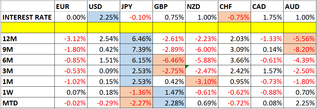 Let’s look at the relevant data of currency price changes and interest rates to date, which we compiled using a trade-weighted index of the major global currencies: