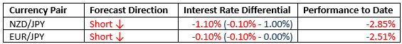 For the month of September, we forecasted that the best trades would be short NZD/JPY and short EUR/JPY. The performance to date is shown below: