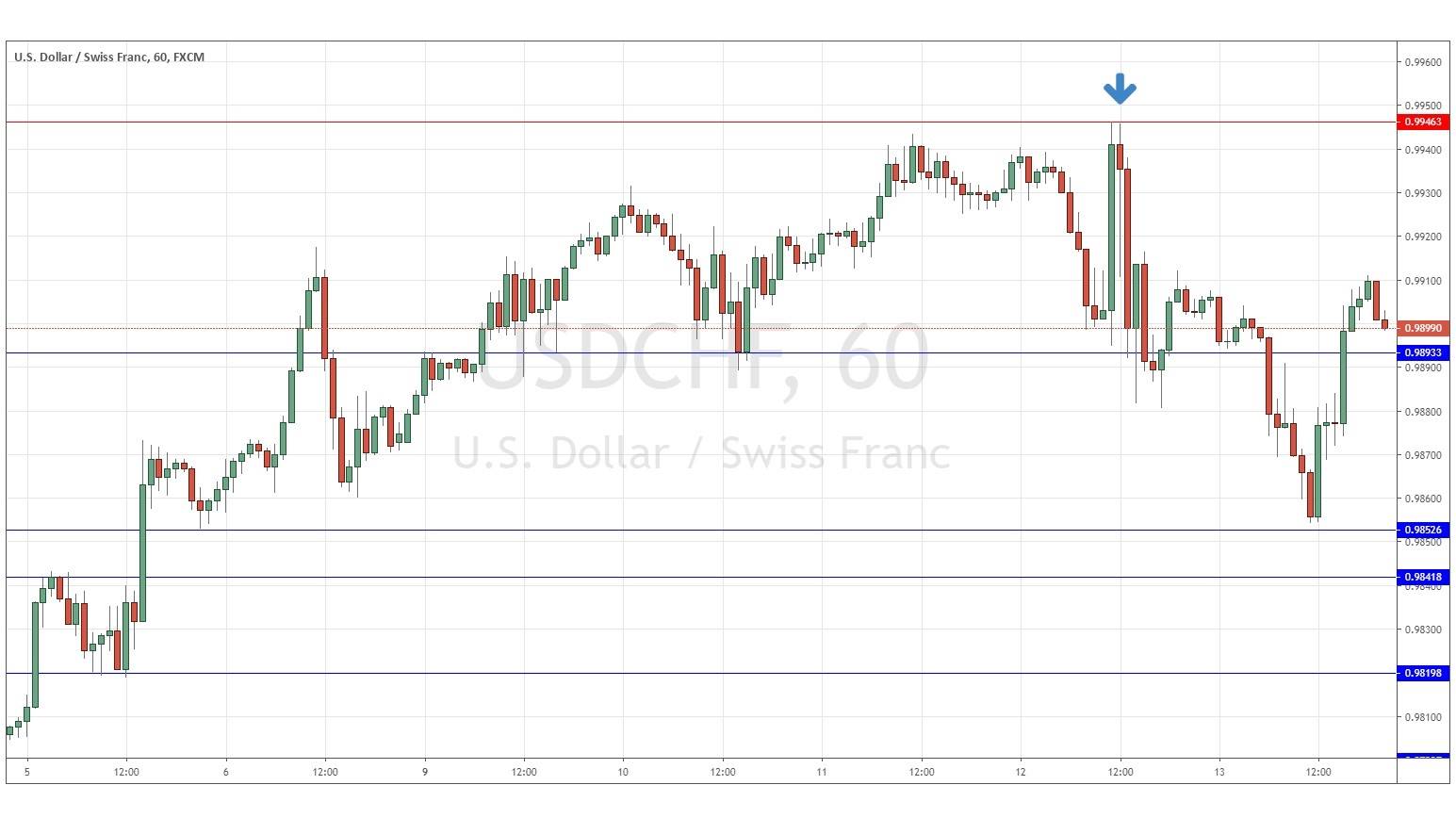 We had expected the level at 0.9946 might act as resistance, as it had acted previously as both support and resistance. Note how these “flipping” levels can work well. The H1 chart below shows how the price rejected this level towards the start of last Thursday’s New York session, turning bearish right away with a large inside candlestick marked by the down arrow signaling the timing of the turn. This trade has been profitable, achieving a maximum positive reward to risk ratio of approximately 1 to 1 so far based upon the size of the entry candlestick structure.