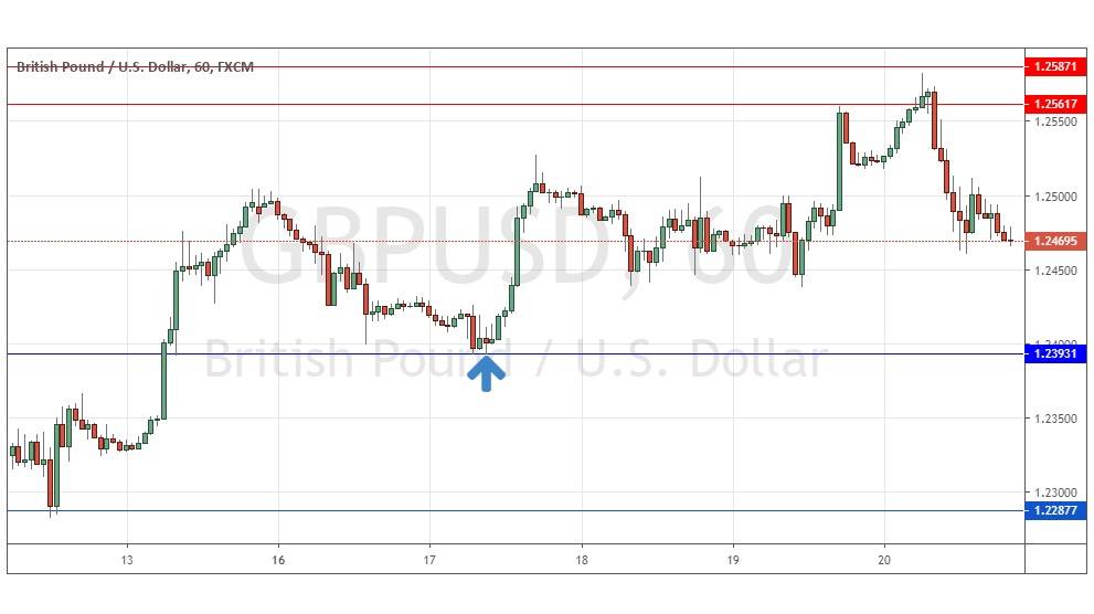 We had expected the level at 1.2393 might act as support, as it had acted previously as both support and resistance. Note how these “flipping” levels can work well. The H1 chart below shows how the price rejected this level right at the start of last Tuesday’s London session (a great time of day to trade the British Pound), turning bullish following a bullish inside candlestick and doji combination marked by the up arrow signaling the timing of the turn. This trade has been very profitable, achieving a maximum positive reward to risk ratio of about 13 to 1 so far based upon the size of the entry candlestick.