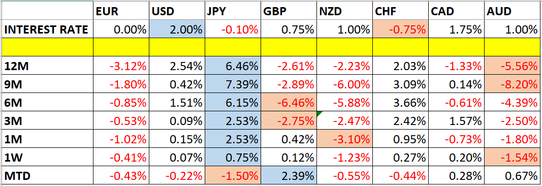 Let’s look at the relevant data of currency price changes and interest rates to date, which we compiled using a trade-weighted index of the major global currencies: