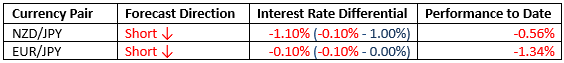 For the month of September, we forecasted that the best trades would be short NZD/JPY and short EUR/JPY. The performance to date is shown below: