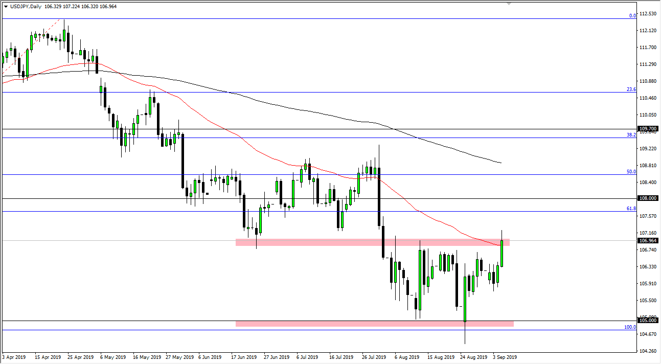 The US dollar has rallied significantly during the trading session on Thursday, reaching above the 50 day EMA before pulling back a bit at the end of the New York session. At this point, the 50 day EMA is starting to offer a bit of resistance, but perhaps more importantly we are seeing the ¥107 level offer resistance. The reason this is important is because it has been the top of the range that we had been stuck in.