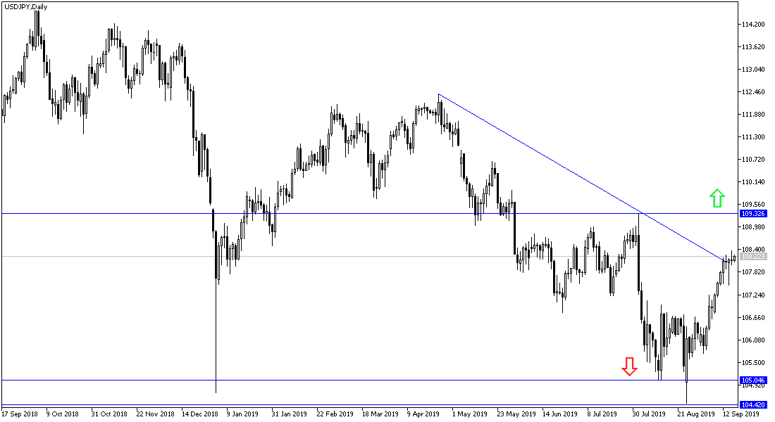 According to the technical analysis of the pair: The current upward correction of the USD / JPY may turn suddenly if the US central bank decides against markets desire, and the supportive to the dollar, with the intention of further easing monetary policy, which paves the way for a further reduction before the end of this year. This confirms that the US economy is already suffering and therefore the closest support levels for the pair are currently at 107.70, 107.00 and 106.20 respectively. The bank abandoning the idea of continuing to ease monetary policy, or not to cut interest rates as expected, would support stronger gains for the pair. Closest resistance levels are currently at 108.85 and 109.30 and 110.00 psychological top respectively.