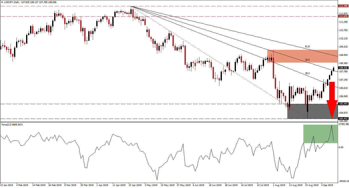 Forex traders should be prepared for a sell-off in the USD/JPY as the 61.8 Fibonacci Retracement Fan Resistance Level is bringing plenty of resistance together with the resistance zone. While current US-China trade war commentary has been more positive, it is unlikely that talks will yield an end to the trade war as differences and mistrust remain elevated. A correction down to the 104.442 to 105.493 support zone, which is marked by the grey rectangle, is expected to unfold as the Force Index extends its move to the downside.