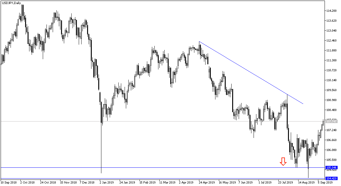 According to the technical analysis of the pair: USD / JPY is on its way towards the 108.00 resistance level, which supports the uptrend strength, breaking through that will support the immediate move towards resistance levels at 108.65 and 109.20 and 110.00 psychological top, which will happen as long as the investors continue to take risks, and there were no negative development of the world trade war. The pair may re-move towards support levels at 107.20, 106.55 and 105.90 respectively, if global trade and geopolitical tensions increase again, the Japanese yen is one of the most important safe havens for investors.