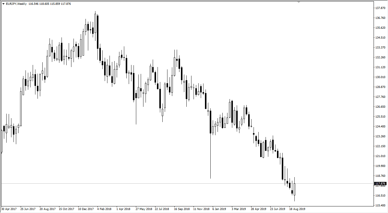 The Euro initially fell during the week against the Japanese yen but bounce significantly from there to break above the ¥118 level at one point. We did give back some of the gains, and I would be the first to point out that we have several long wicks just above the area that we are at right now. In other words, there are plenty of things to point at resistance above and therefore I’m looking to fade rallies although I am the first to admit that this was a rather impressive move.