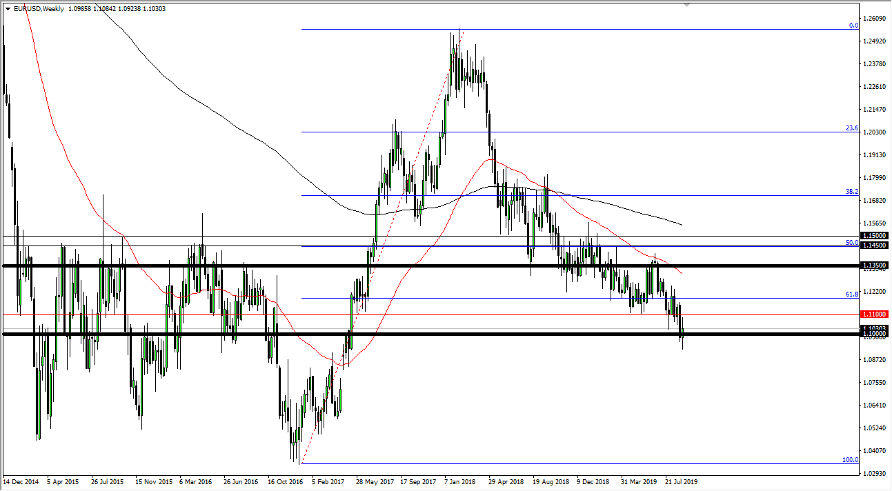 The Euro has been all over the place during the past week, as we got below the 1.10 level. At this point though, it’s very likely that we will continue to see negative pressure but a short-term bounce could occur. The 1.11 level offer significant resistance that extends to the 1.12 handle. A move towards that level should be sold on the first signs of exhaustion, as negative yields in the bond markets of the European Union continue to throw money toward the Americans. If we break down below the bottom of the candle stick, then it’s likely that we continue our move lower. Longer-term I think we’re going after the 100% Fibonacci retracement level, which is closer to the 1.04 level.