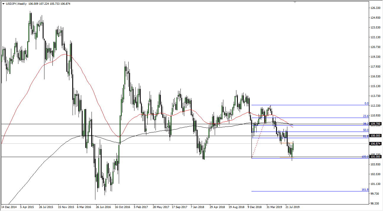 The USD/JPY pair has had a slightly positive candle stick for the week, and now it looks like we could perhaps try to break above the ¥107 level. If we can get above there, then it’s likely that we could go towards the top of the breakdown candle from several weeks ago, meaning a move towards the ¥108.50 level. Signs of exhaustion will be sold though. Beyond that, it’s very likely that the market would consolidate between here and the ¥105 level. Either way, I have no interest in buying in I’m simply looking for exhaustion to take advantage of.