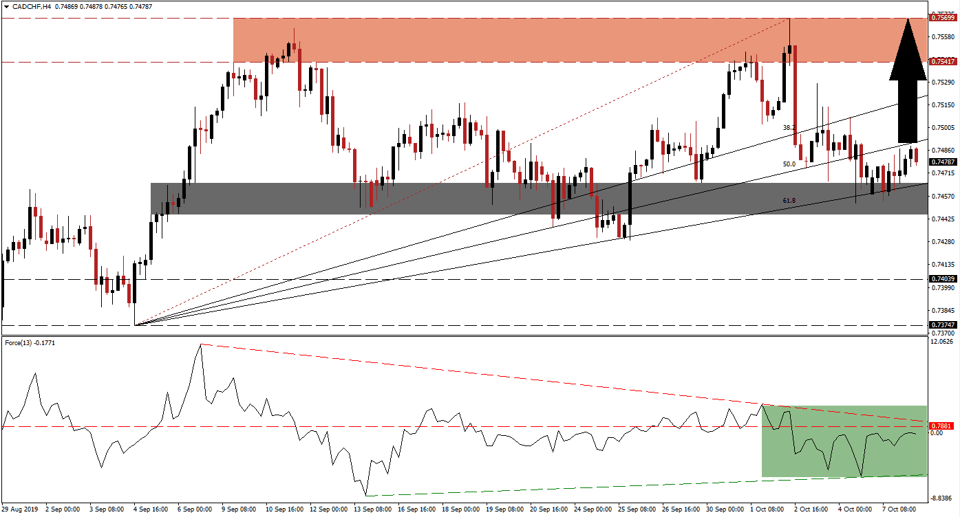 This currency pair should be able to accelerate back into its resistance zone which is located between 0.75417 and 0.75699 as marked by the red rectangle. A breakout in the Force Index is required for the CAD/CHF to push further to the upside. Oil prices have supported the Canadian Dollar since the attacks on two key Saudi Arabian oil facilities last month, but election uncertainty has kept bullish momentum in check. The Swiss economy has stuttered after a period of relative strength as compared to other developed economies, this fundamental combination is expected to support price action to the upside over the short-term. You can learn more about a Breakout, a Breakdown and the Resistance Zone here.