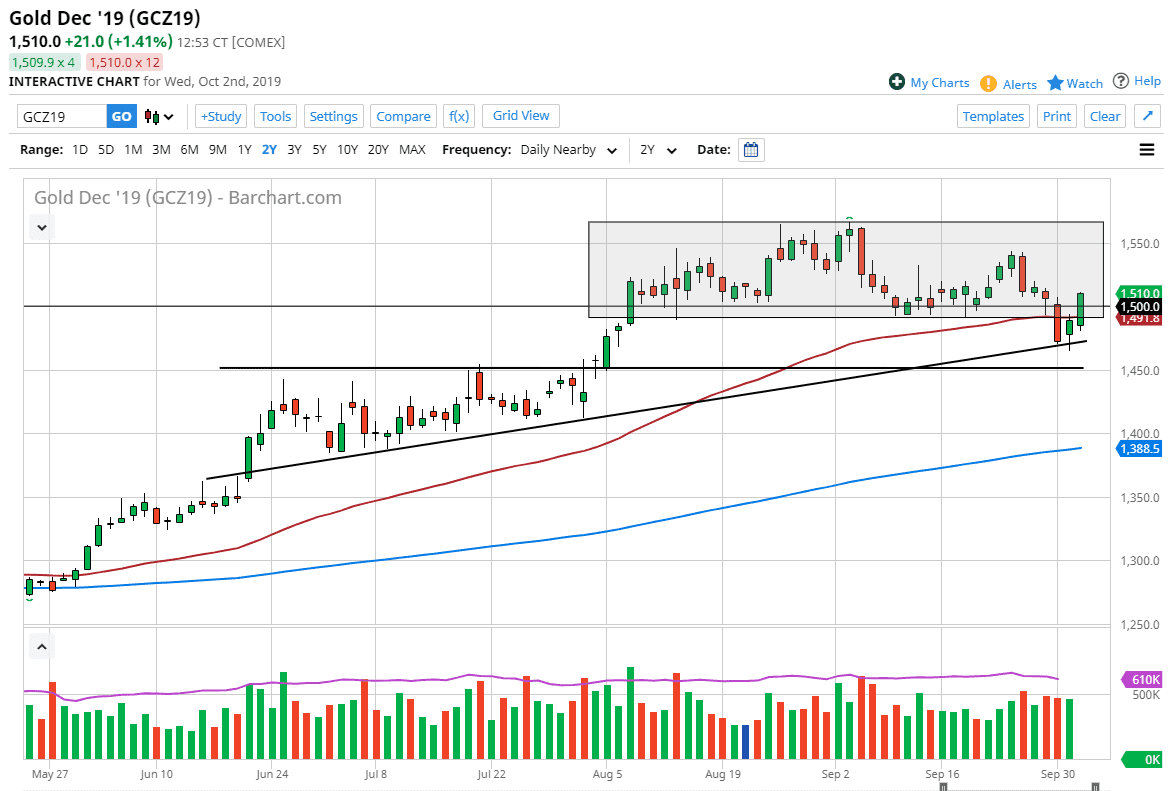 Gold markets have rallied quite nicely during the trading session on Wednesday, as we have broken back above the $1500 level which of course is a psychologically important victory. We are now well above the 50 day EMA and it looks as if the Gold markets are going to try to reenter the previous consolidation range. At this point, the $1540 level should offer resistance, but minor at best. Remember, a lot of this is going to be due to central banks around the world continue to cut interest rates and of course adding to quantitative easing. At this point in time, I think that is one of the great propellants of gold to the upside.