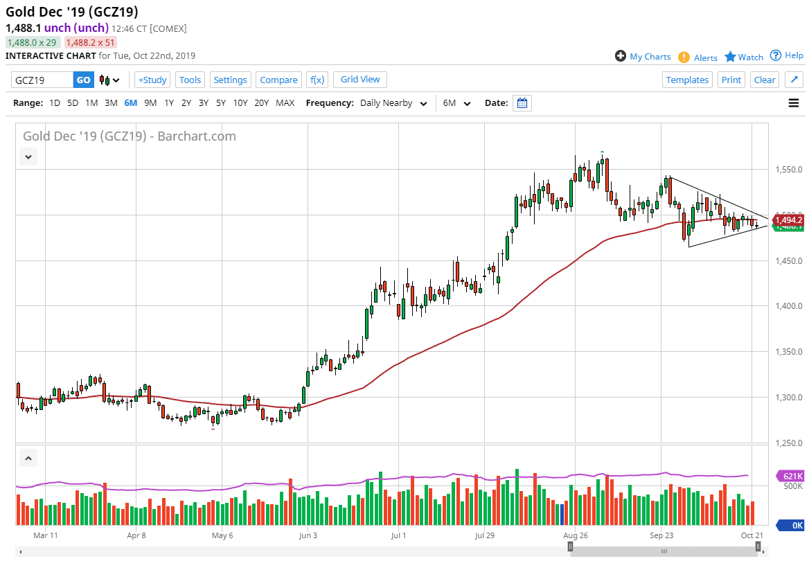 Ultimately though, the US stock markets continue to try to drive higher, and if the US dollar starts to lose value, that could also provide more rocket fuel for the gold market. Looking at this, I believe that we will eventually see this market take off but we need some type of catalyst. We are in the middle of the earnings season, so if the stock market breaks out to the outside bank could send this market down to the lower levels underneath that offer support. The $1450 level is another support level, which would be an interesting area due to the fact that it is the top of the ascending triangle from previous moves. At this point, use the trendlines as a bit of a guide.