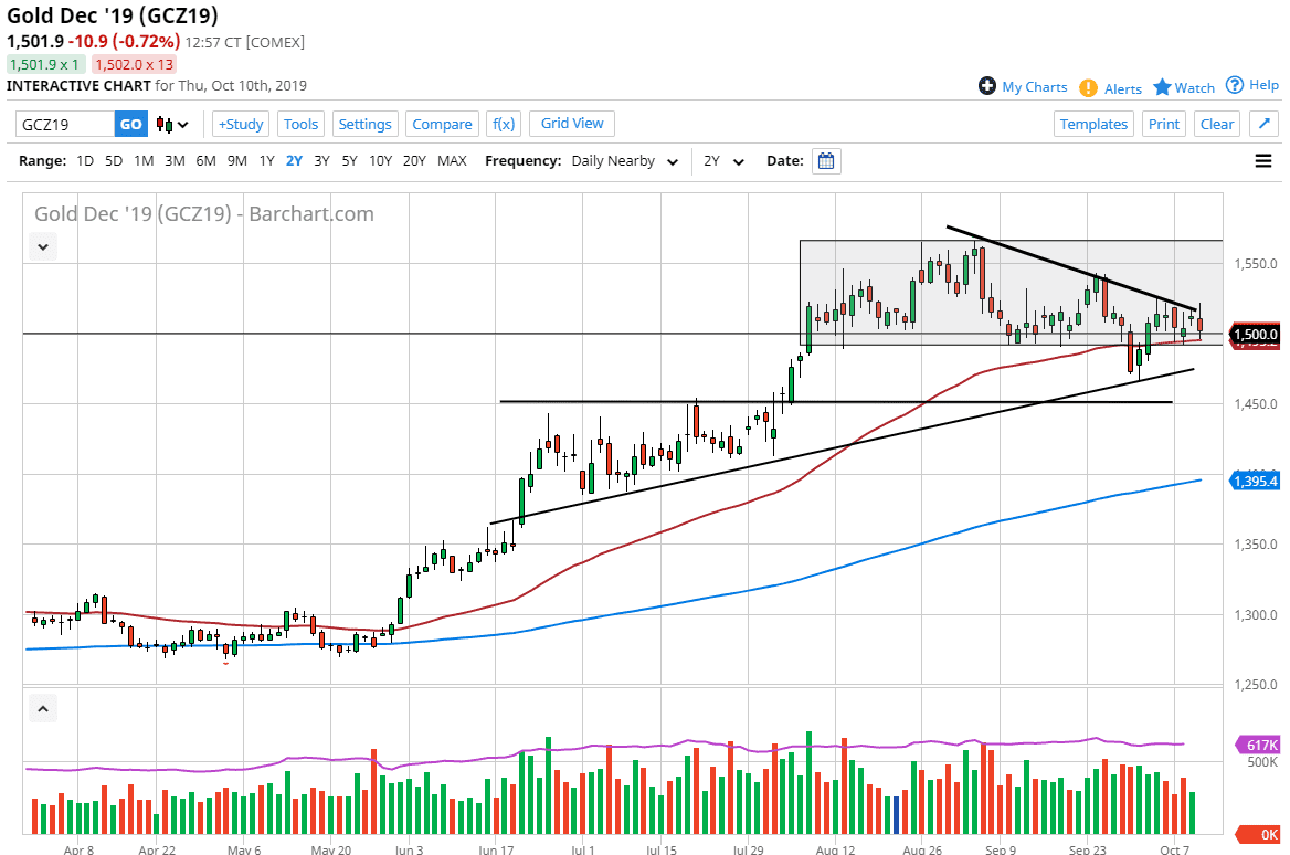 Gold markets have initially tried to break out during the trading session on Thursday as a rumor came out that the Chinese were going to leave the trade talks a day early. As soon as the South China Morning Post came out and denied the claims, the market turned right back over and started falling. The Gold markets had initially tried to break out above a significant downtrend, but then found enough support underneath at the 50 day EMA. Looking at this chart, we are in a larger wedge overall, and although we have pulled back quite a bit it suggests that we have still plenty of buyers underneath.
