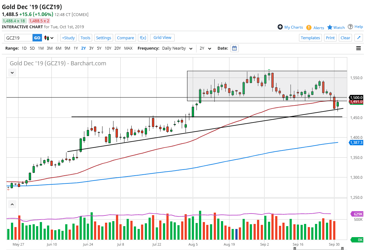 Gold markets initially fell during the trading session on Tuesday after gapping higher. By breaking down through the trend line, it was a sign that perhaps the market was ready to break down. It would have been a bit of a continuation of the massive resistance and selling pressure that had been seen on Monday, but as the ISM number came out weaker than anticipated, money flew into the Gold markets as a bit of a hedge against the idea of the Federal Reserve cutting rates even further.