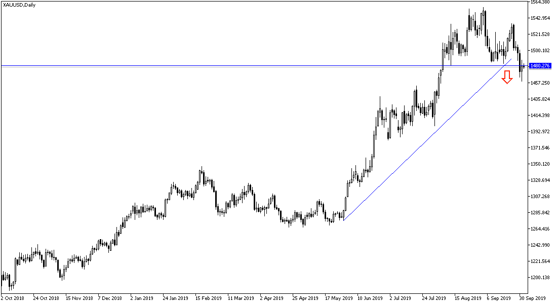 The gold price rebounded from its lowest level in nearly two months during Tuesday's trading session, rising to $1487 an ounce after testing the $1459 support. The US dollar's gains were stalled and investors returned to safe havens again, which gave the yellow metal new impetus. The decline in the US ISM manufacturing index to its lowest level since 2009 led to a decline in the major US stock indices, which increased demand for the precious metal. The data showed the manufacturing index fell to 47.8% last month from 49.1%, its lowest level since June 2009; the time when the Great Depression ended.