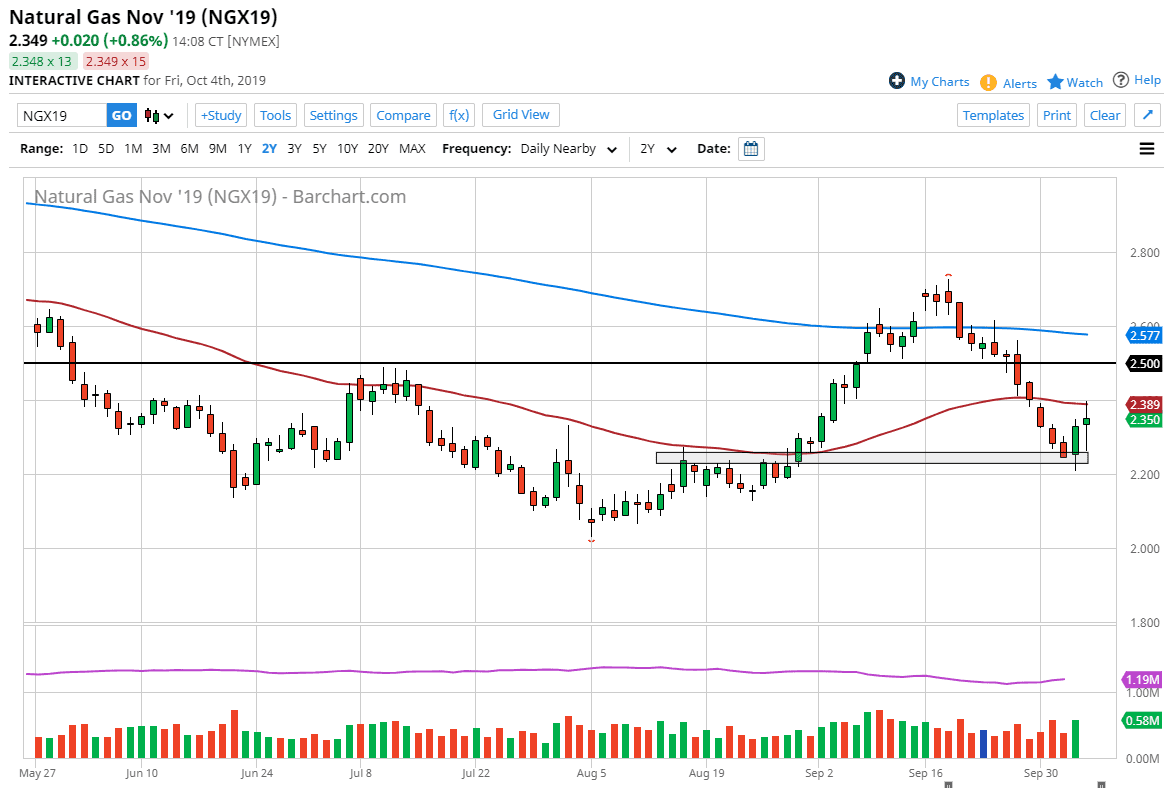The natural gas markets initially fell during the trading session on Friday, reaching down towards the significant $2.20 level. That level has now offered quite a bit of support over the last couple of days, and then bounced quite significantly during the trading session as well to crash into the 50 day EMA. That being the case, we ended up forming a bit of a hammer, which of course is a bullish sign.