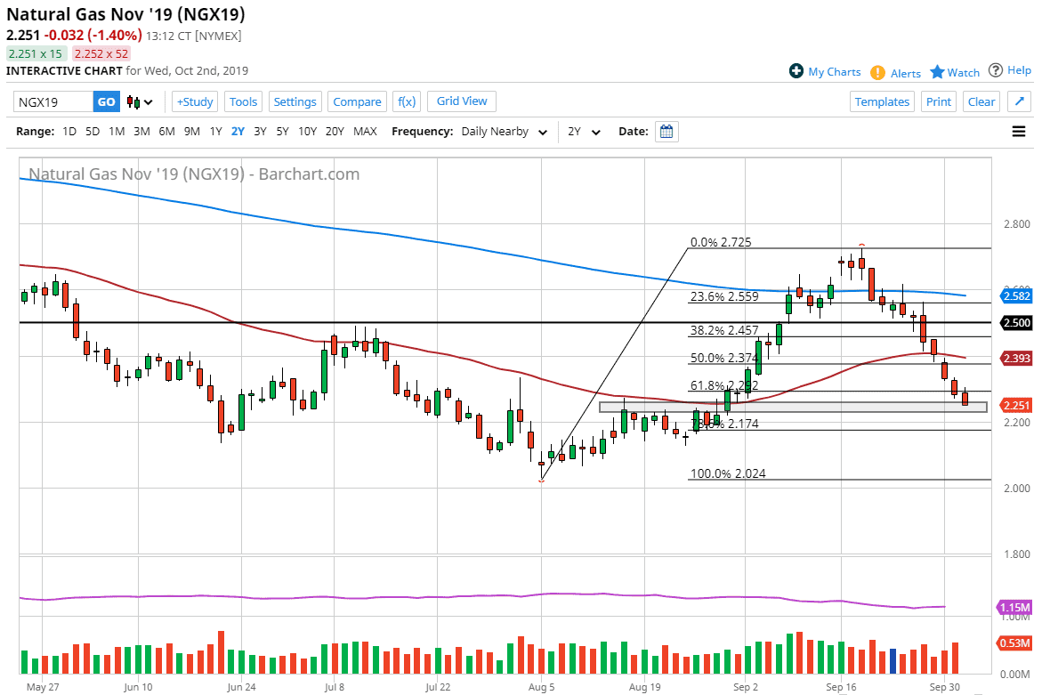 If we were to break down below the $2.20 level, then it’s possible that the $2.15 level gets tested next. I’d be very surprised to see that level broken down through, and if we did it’s possible that we may not get the Winter pop at all. Obviously though, whether has a huge part to play in the natural gas markets, so once the cold weather comes, you will see a sudden spike in this market as we do every year. It’s simply a matter of paying attention to weather reports for places like Boston, New York City, and Amsterdam. All things being equal, I am simply waiting for some type of daily close that is bullish to get involved. I am not trading intraday at this point.