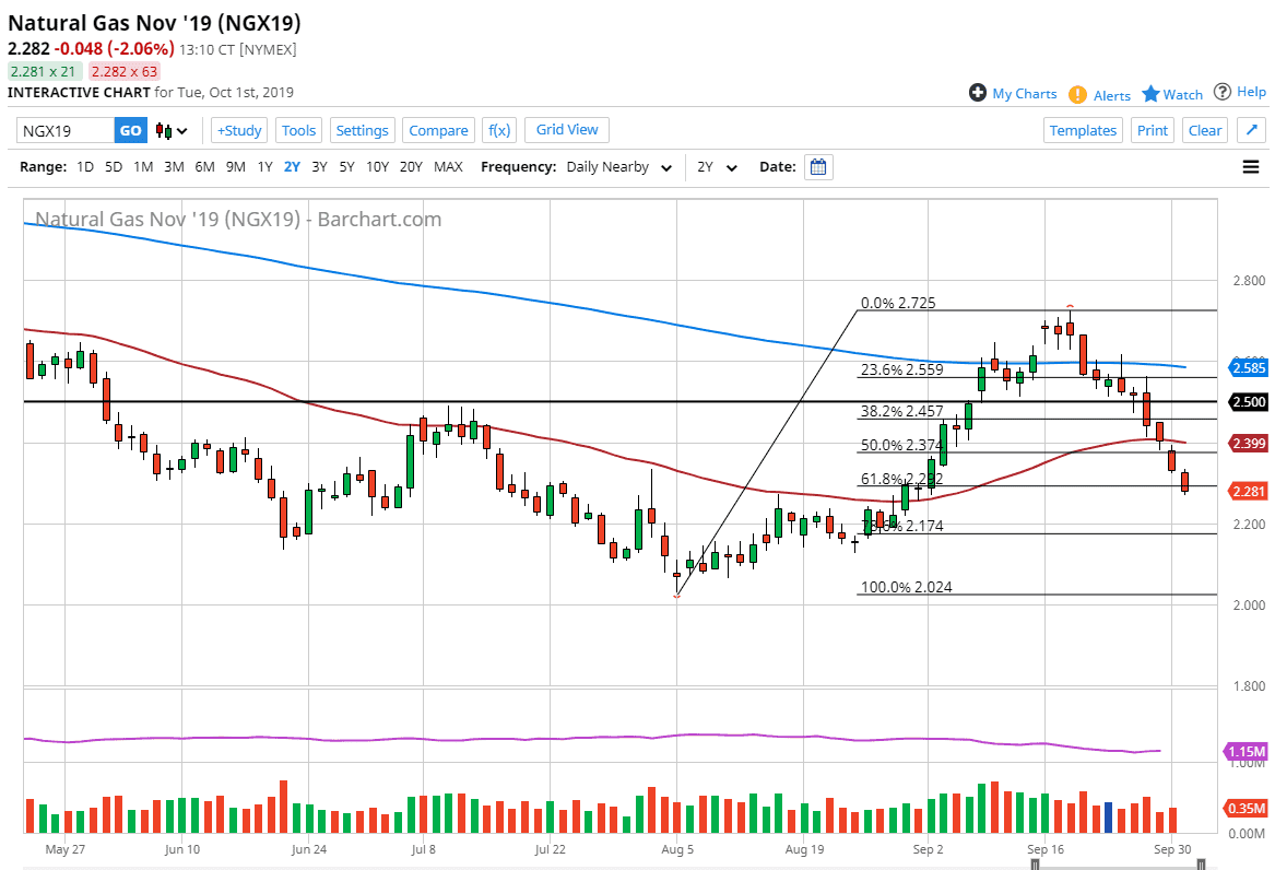 Natural gas markets have fallen a bit during the trading session on Tuesday, slicing through the $2.30 level. This is also where we had seen the 61.8% Fibonacci retracement level. At this point, the market should eventually see buyers, but based upon the candlestick that we have printed for the Tuesday session, it’s very unlikely that we are quite ready to turn around and go higher. That being said though, I think there is a lot of support underneath, and it’s likely that the market will eventually find it. However, as this is a major shift in sentiment and of course a major shift for me, I believe in waiting for a daily signal to start buying.