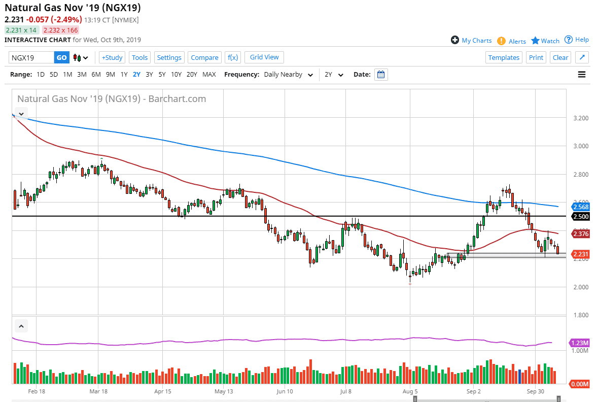 I believe that support extends down to at least the $2.20 level, and perhaps even lower than that. However, I recognize that waiting for some type of bounce is something that will need to be done. The think that natural gas is going to continue to go much lower for the longer-term is to ignore the fact that demand will certainly be picking up as we head into winter. We are currently trading the November front contract, so it makes quite a bit of sense to consider that the cold weather will eventually become the main feature of this market. However, we have not gotten to that part yet and as a result we continue to find this market drifting lower.