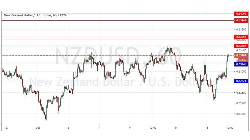I wrote yesterday that I would take a bearish bias later if we had gotten two consecutive hourly closes below 0.6250. Luckily this was just barely avoided, but I was correct to see this price as pivotal as there was a strong rise from there, concurrent with AUD/USD, as the New York session got underway. However, the AUD/USD currency pair looks generally more bullish than this one, so while I can see AUD/USD continuing to rise significantly, I suspect this pair is likely to keep on ranging. Therefore, I see the best potential trade set-up which might occur today as a short trade from any of the resistance levels shown in the price chart, especially 0.6348 as it is confluent with the half number at 0.6350.