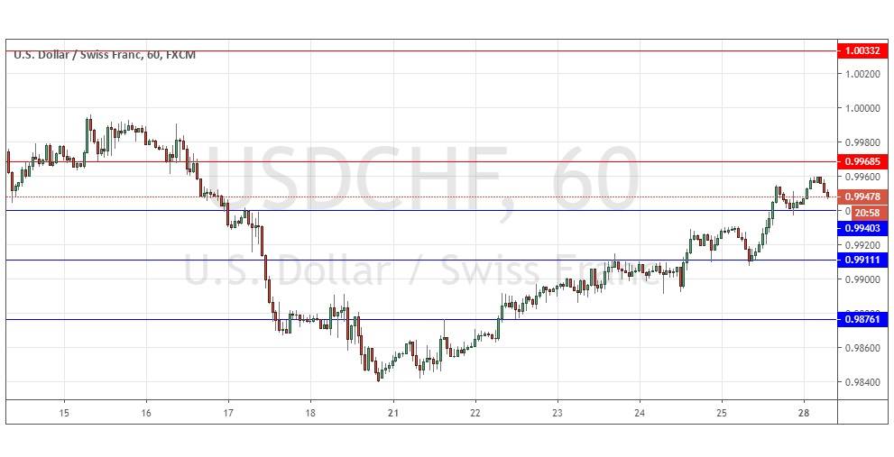 We have seen a weakly bullish trend over the past few days and are currently seeing a bearish retracement which looks likely to hit the new higher support at 0.9940. If there is a bounce there, it may be good for a long scalp at least or maybe even something stronger. However, overall it is likely to be a quiet Forex market today.USDCHFThere is nothing of high importance due today concerning either the CHF or the USD.