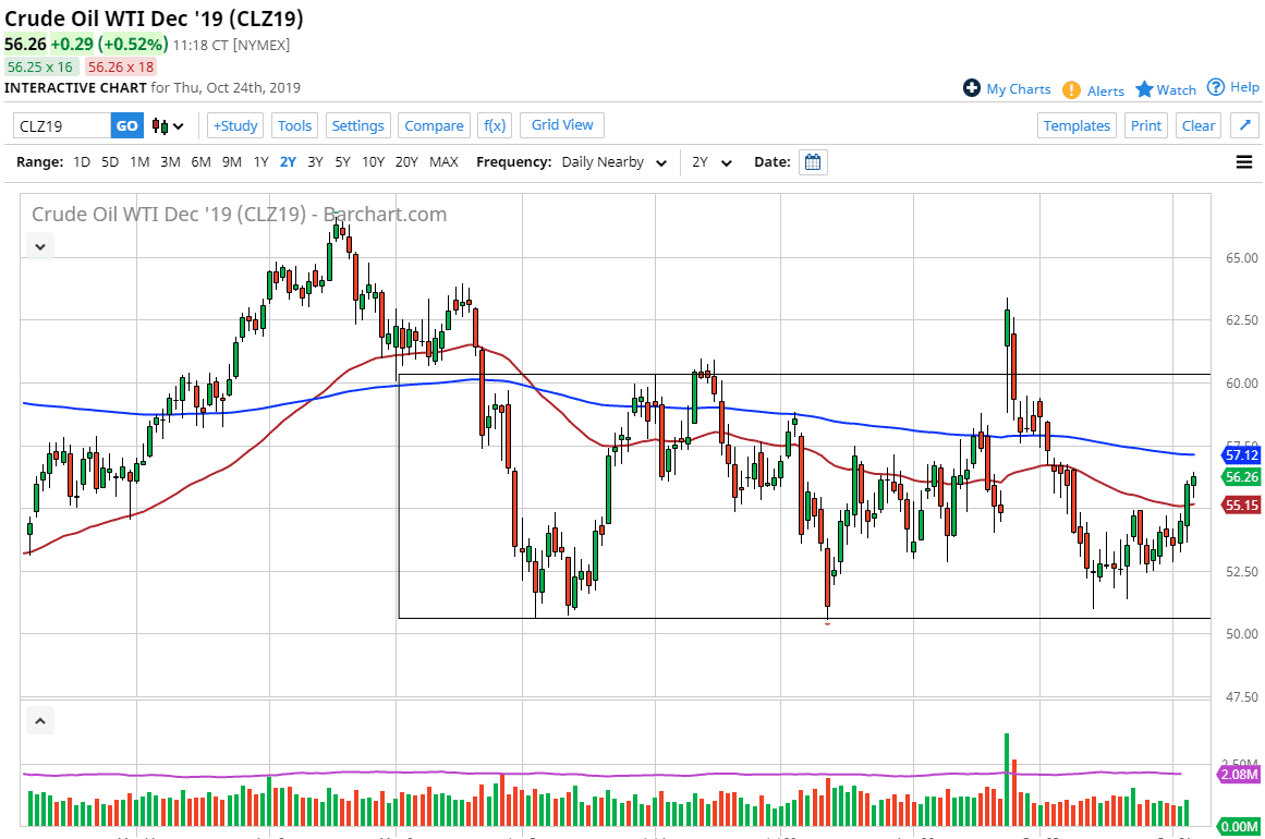 When you look at the longer-term chart, we could see that there is essentially a range bound attitude to this market between the $50 level in the bottom and the $60 level and the top. If that’s going to be the case, then we should have further to go but it may take some time to get there. I like the idea of buying these dips for short-term moves. I don’t necessarily think that you can buy and hold, mainly because there isn’t much in the way of conviction even though it’s been a slow and steady grind higher.