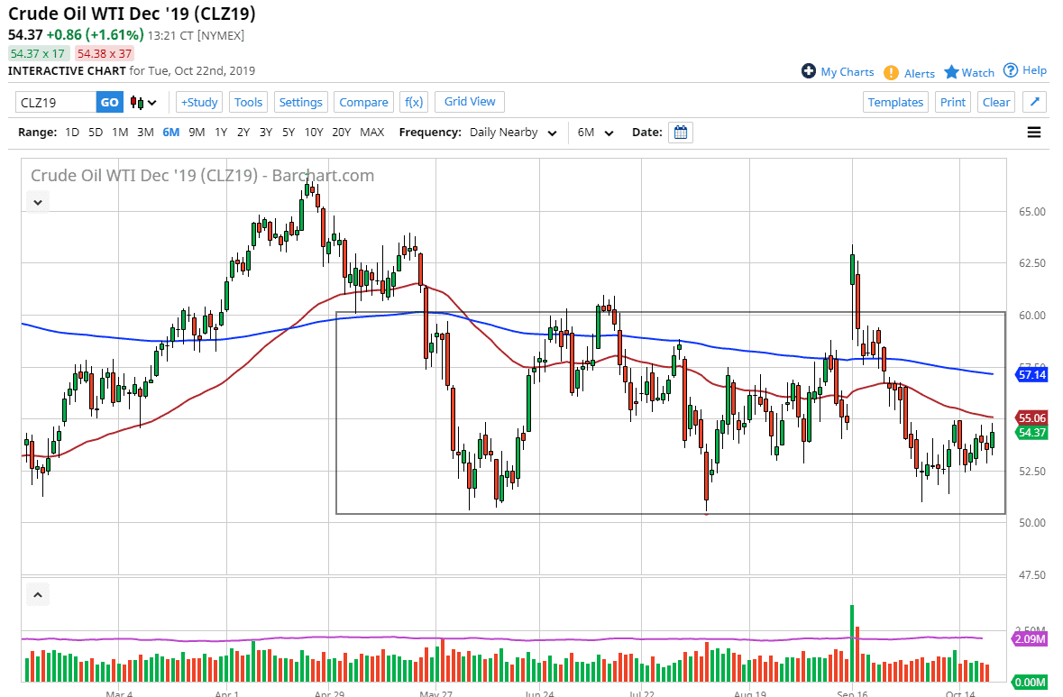 The West Texas Intermediate Crude Oil markets have rallied a bit during the trading session on Tuesday, as we continue to build a bit of a base between the $52.50 level and the $55 level. This is an area that can cause quite a bit of noise, as seen on the short-term charts. That being said though, it’s very likely that the market will eventually find a catalyst to break higher. During the Tuesday session, we did start to see the first rumblings of something that could in fact come into the picture.