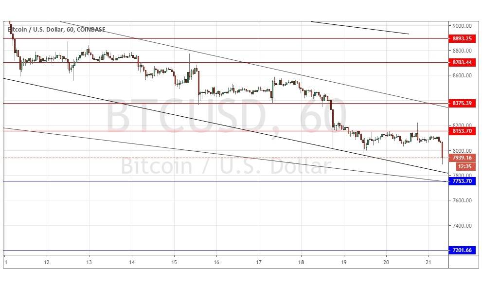 I also noted yesterday that the nearest support level shown in the chart at $7,754 could become a very interesting entry point for long-term buyers, due to its confluence with the lower channel trend line and the psychological quarter-level at $7,750. The confluence is even stronger today and this level is certainly in play as a possible entry point for long-term buyers. Anyone holding a short trade should seriously consider taking at least partial profits in the $7,754 area.