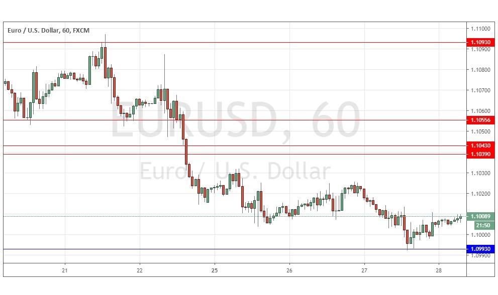I wrote yesterday that I would be very interested in a long trade entry from a bullish bounce at 1.0993, or a short trade entry if we had gotten a couple of hours consecutive closes below 1.0993 during the day’s London session. This was a good call as the level was the low of the day to the pip, holding effectively as support. However, the action was very quiet overall and the bounce was strong enough to trigger an entry signal.