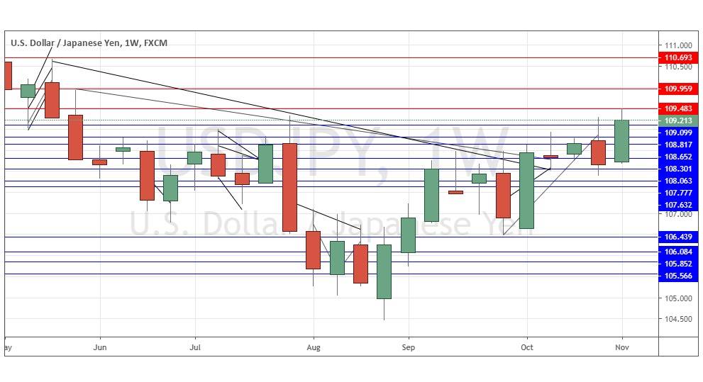 The weekly price chart below shows last week printed a bullish engulfing candlestick, which closed within the top quartile of its range. It was the highest weekly close in 23 weeks. These are bullish signs, suggesting that the price is likely to rise further over the course of the coming week. Buying dips at the support at 109.10 or 108.65 may be the most fruitful strategy using tight stop losses or waiting for a daily close above the resistance at 109.48 for a breakout-style trade.