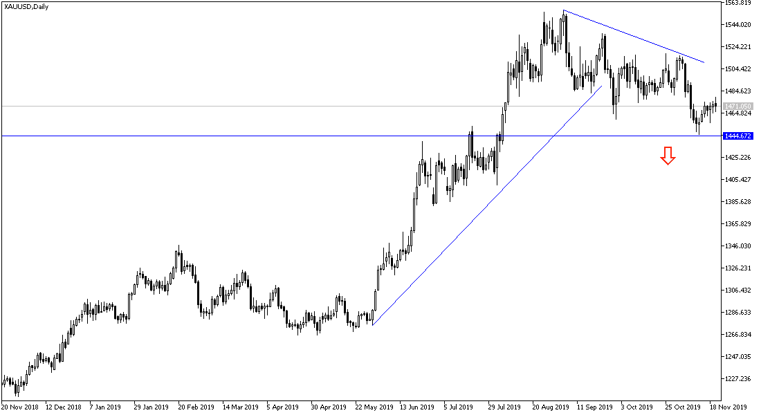 According to the technical analysis of gold: The bullish correction of gold still needs to move towards $1485 resistance and the $1500 psychological resistance to confirm the strength of the change of direction. At the same time, technical indicators are preparing for a change of direction, which was downward before the middle of this month, which pushed the price towards the support of $1446, the lowest for more than three months. In contrast, support levels at 1468, 1455 and 1440 are a strong and direct threat to these expectations. Gold is watching the dollar and renewed global trade and geopolitical tensions to determine the right course.