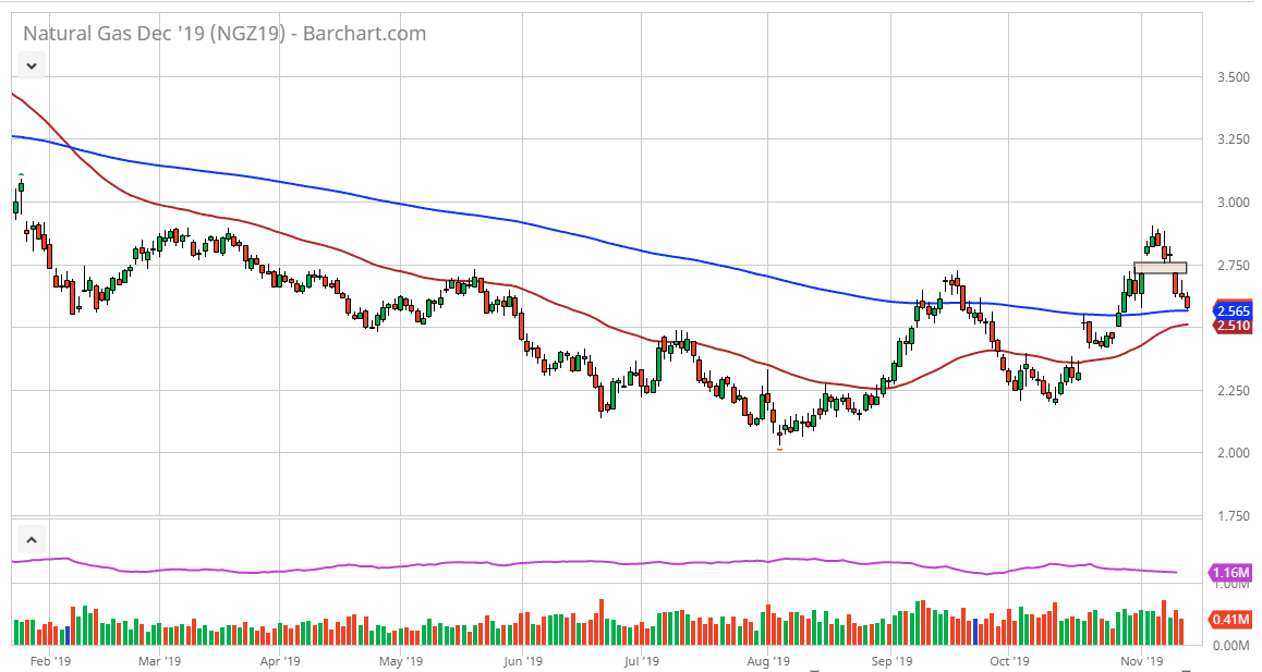 That being said there is also a gap at the $2.75 level, so it shows complete chaos and confusion in this market, like so many of the other ones that I follow at this point. Expect a lot of volatility and choppiness but short-term back-and-forth trading is probably about as good as this is going to get right now. If we do break above that gap at the $2.75 level then it opens up the door to the $3.00 level, but quite frankly it’s difficult to imagine a scenario where it can be easily done. We need to see some type of massive drop in inventory for natural gas to finally break out to the upside. If we can break out to the upside the target initially would be the $3.00 level, and then possibly higher than that. A move above there probably has the market looking for $3.25 but that’s probably more of a December story than right now. Expect a lot of back-and-forth trading but I would still have a bit of an upward bias as long as we don’t breakdown through that gap underneath. I like natural gas is time year but quite frankly it has not been acting well, as production had increased so much earlier in the year that it is taking longer than normal to burn through supply.