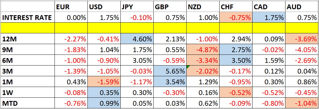Let’s look at the relevant data of currency price changes and interest rates to date, which we compiled using a trade-weighted index of the major global currencies: