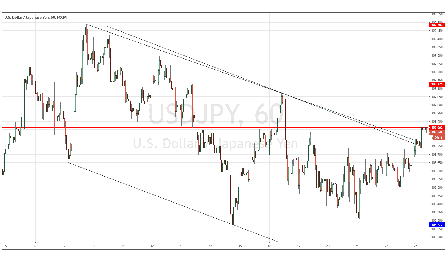 I was correct about 108.86 being significant resistance, as the price has for the past few hours been trying to break above it without success. Nevertheless, the bullish breakout from the wide bearish channel shown within the price chart below is a bullish development. The problem for anyone wishing to trade this pair is that price action is very choppy and congested, and volatility is extremely low, so the price is not moving much, and when it does move, it moves with little directional momentum.