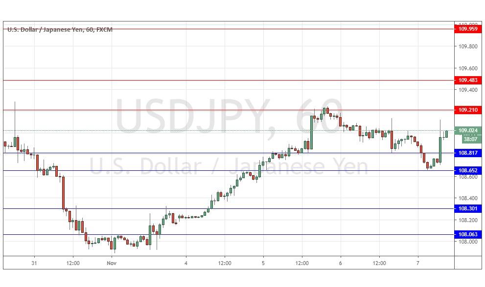 Yesterday’s signals produced a nicely profitable trade near the end of the Asian session: a long trade entry from the bullish inside candlestick breakout which rejected the support level at 108.65. Profits should be taken near 109.00 to take off the risk, or now, and then further profits can be taken if and when the price falters near higher resistance levels.