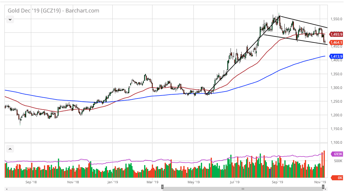Gold markets have fallen a bit during the trading session on Friday, reaching down towards the $1460 level. The market has even more support just below at the $1450 level. This a market that is certainly in trouble, mainly because the US/China trade talks had gotten a little bit more optimistic, which works against the so-called “safety trade.”
