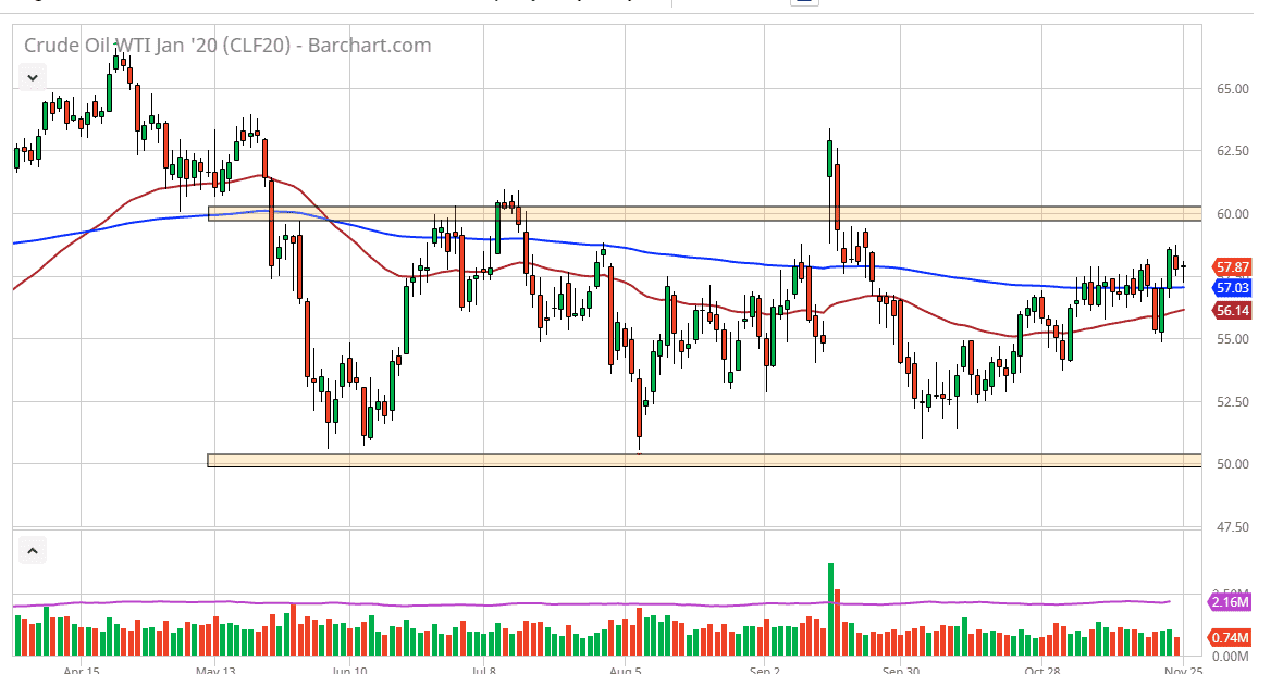 I do not think that this market is going to break through there easily, so it’s likely that this is a short-term buying opportunity more than anything else. However, if we were to break above the $60 level, then the market could go to the $62.50 level. Looking at this market, if we were to pullback from here, there is a ton of support underneath based upon several attempts to break down but yet the buyers continue to come back. Looking at this chart, I would also argue that there is support in the 200 day EMA, and of course the 50 day EMA. If we do get the 50 day EMA jumping above the 200 day EMA, then it’s the so-called “golden cross”, which is a longer-term buy-and-hold signal. At this point I think short-term buyers continue to come into this market and supportive, so if you are a short-term trader, this is a good market for you. Otherwise, if you are a longer-term trader you are going to continue to see this market chop around.